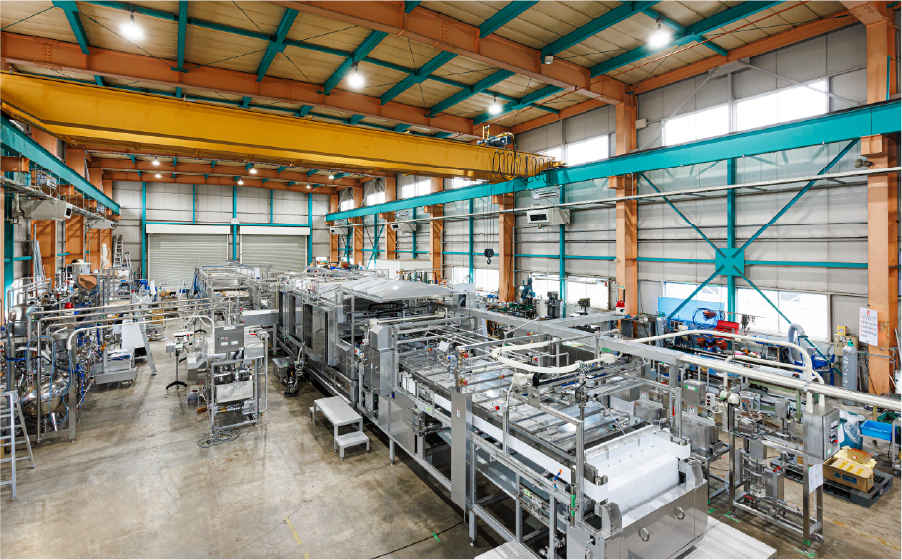 豆腐・油揚げを中心とした大豆加工食品の製造ラインを一貫して構築する食品機械メーカーです。単体機の導入から工場全体のレイアウト設計、独自のCIP洗浄システムによる衛生対策まで、生産現場に最適な設備をトータルで提供しています。